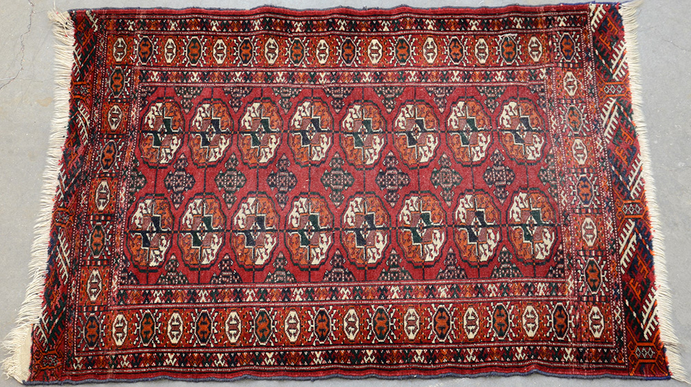 [Tappeti] Tappeto Bohukara, Turkestan occidentale , secolo XX. Disegno a Gul su fondo rosso (cm 110x82) (difetti)