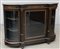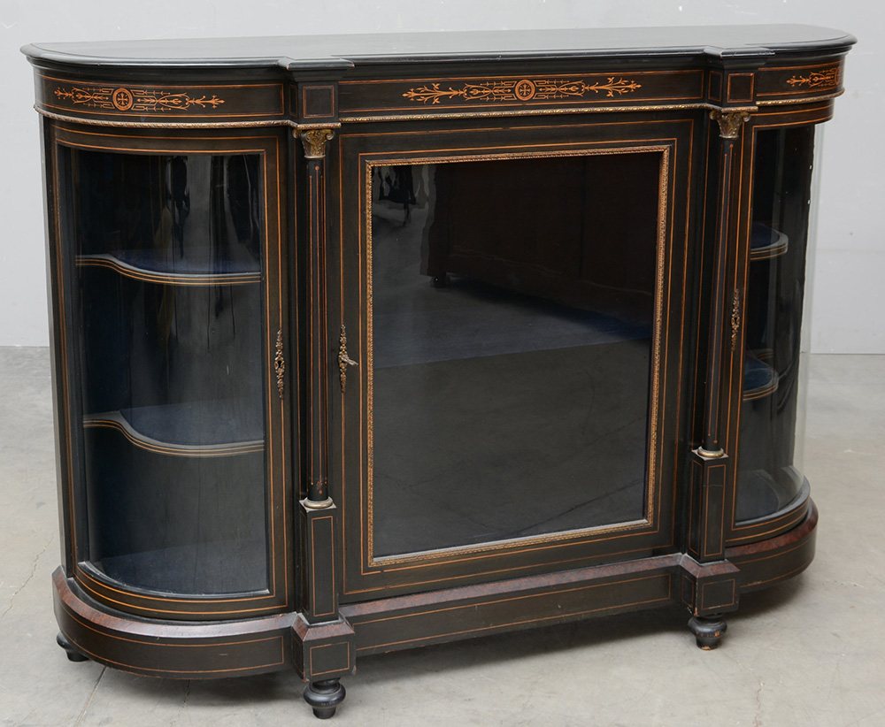 Sideboard di forma scantonata, intarsiato e filettato, in legno ebanizzato con tre ante a vetri, due colonne laterali aggettanti a tutto tondo, guarnizioni in metallo. Sec. XIX (cm 150x109x46) (difetti)