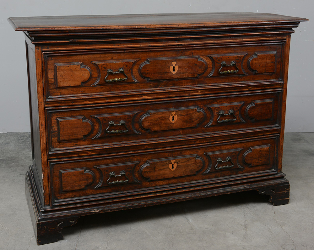 Canterano in noce a tre cassetti decorati con pannelli sagomati in rilievo. Piedi anteriori sagomati, a mensola. Sec. XVII (cm 152x108x65) (difetti)
