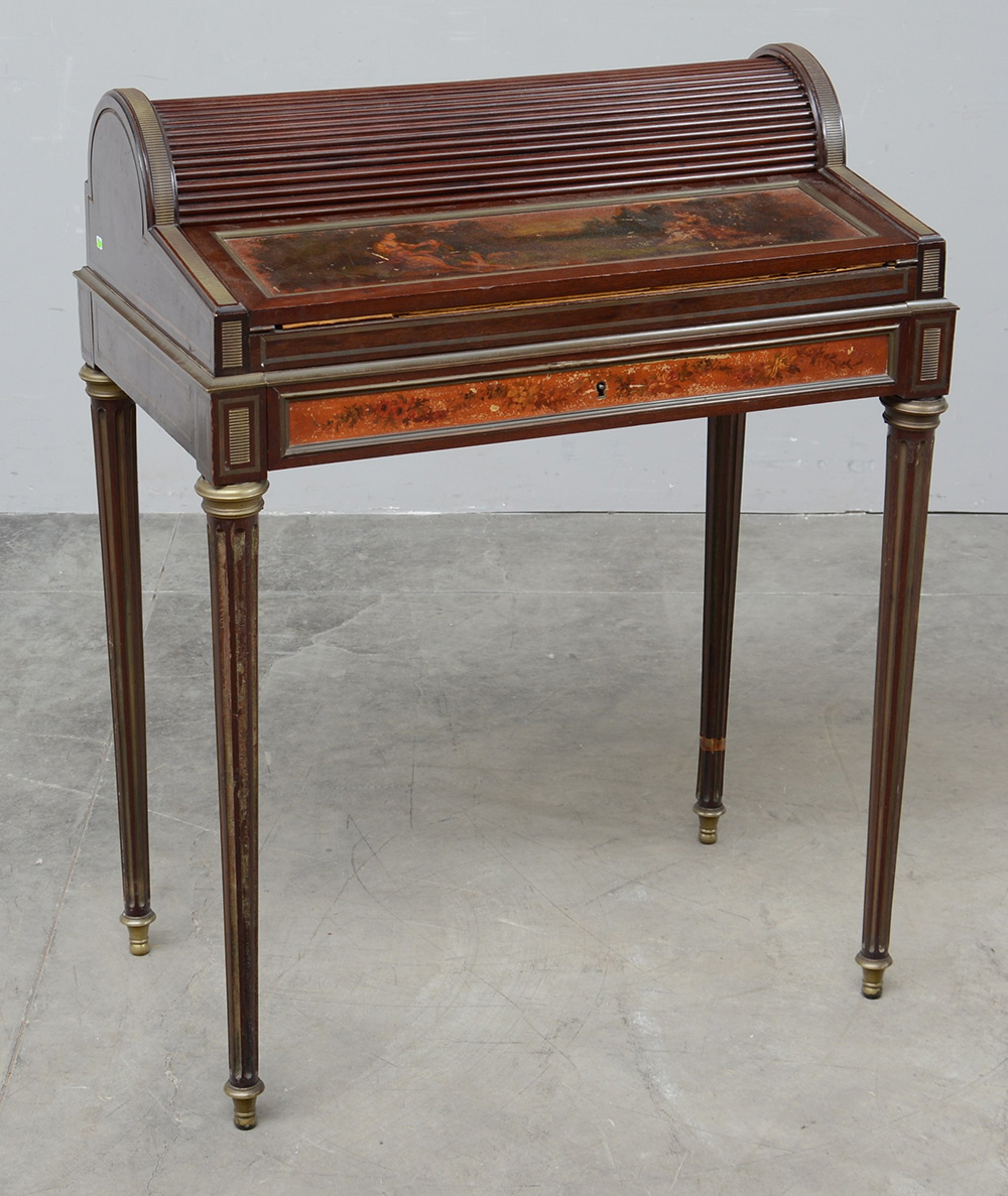 Piccolo scrittoio inglese in mogano con piano scrittoio a scomparsa, un cassetto nella fascia e tre interni. Guarnizioni in metallo e gambe scanalate (cm 68x86x40) (difetti e mancanze)
