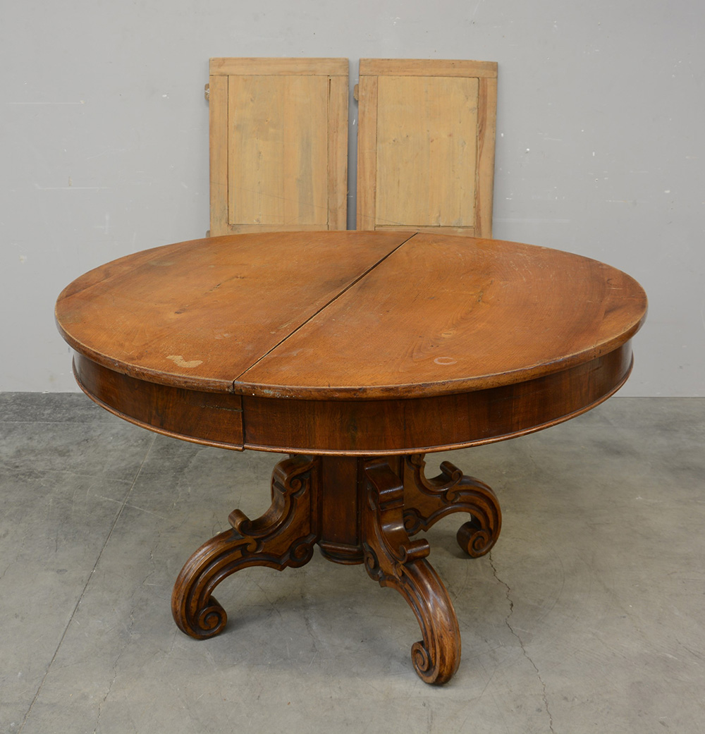 Tavolo tondo allungabile in noce con sostegno squadrato, quattro gambe sagomate e intagliate munito di due prolunghe (d cm 128, h cm 81) (difetti)