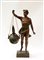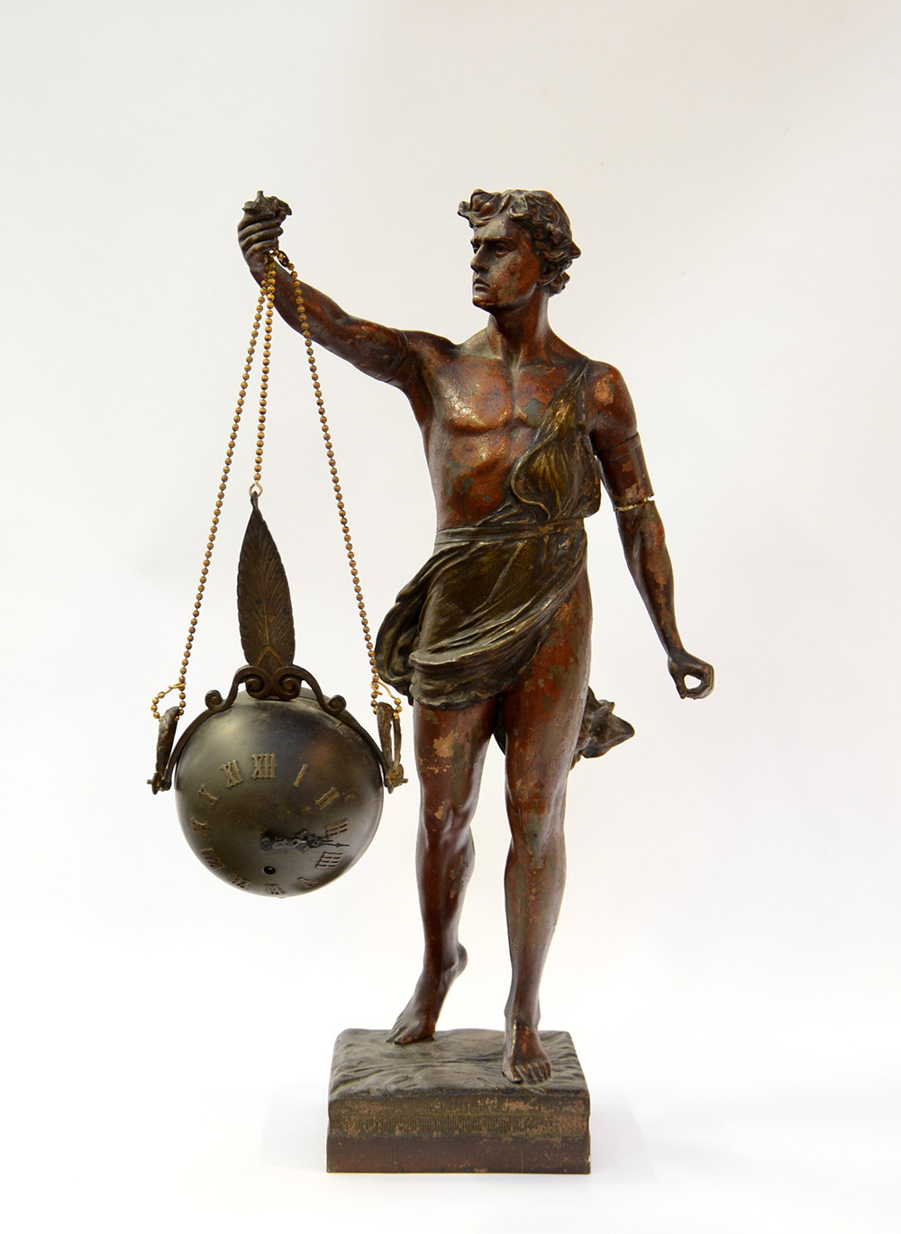 Orologio in metallo con quadrante a numeri romani sorretto da una scultura raffigurante figura maschile a tutto tondo (h cm 68) (difetti)