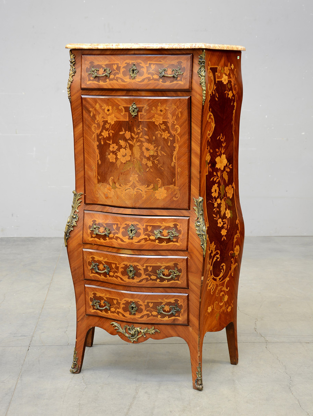 Secretaire "olandese" di forma mossa riccamente intarsiato a motivi floreali. Fronte a quattro cassetti ed anta ribaltabile, guarnizioni in bronzo, piano in marmo (cm 75x139x37)