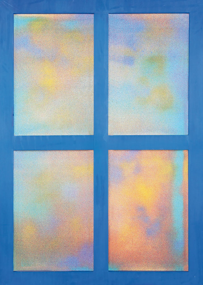 TANO FESTA Roma 02/11/1938 - Roma 09/01/1988 Finestra serigrafia su tela e legno cm. 100x70, riproduzione di un'opera di Tano Festa del 1985, realizzata dopo la scomparsa dell'artista nel 1990, firma, titolo e data riprodotti tramite serigrafia e certificato al retro con numerazione 009/B al retro.