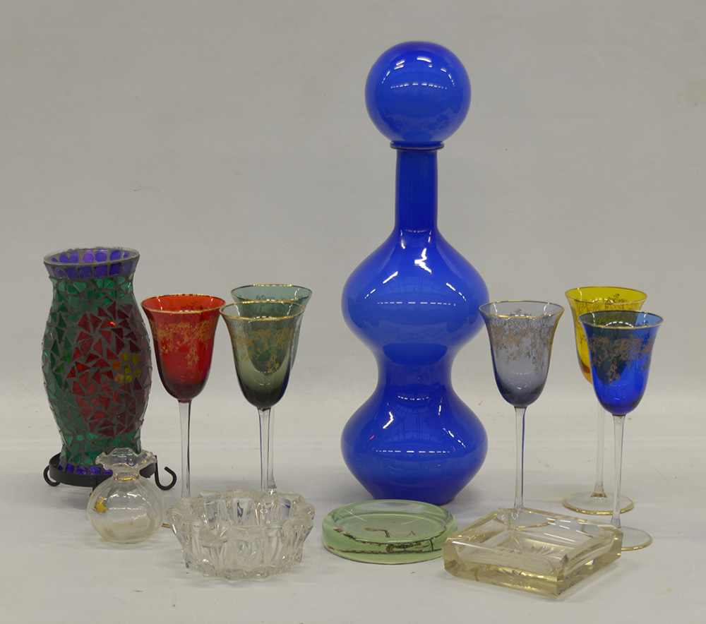 Lotto composto da una bottiglia con tappo, sei bicchieri, due vasetti e tre posaceneri di diversa forma e decoro (difetti)