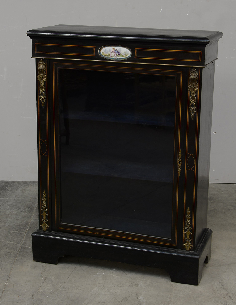 Credenza filettata ad un'anta, in legno ebanizzato con guarnizioni in metallo e placchetta in porcellana raffigurante una scena galante. Sec. XIX (cm 75x106x32) (difetti)