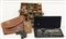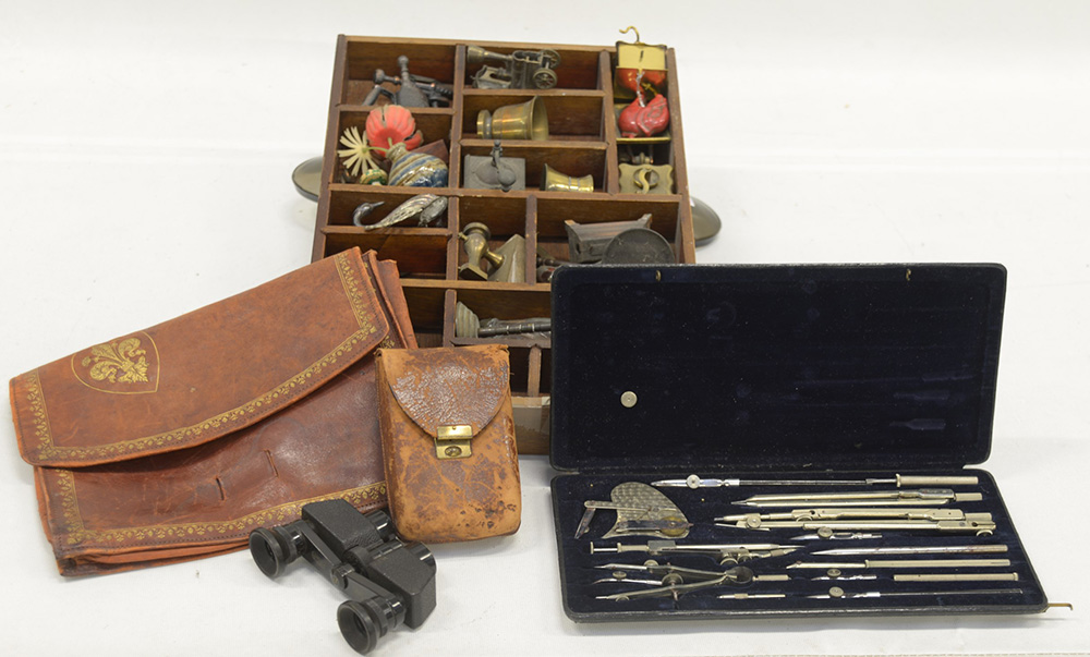 Lotto composto da una piccola bacheca contenente oggettini vari, un compasso e binocolo in custodia e un portadocumetni in pelle in pressa in oro (difetti)
