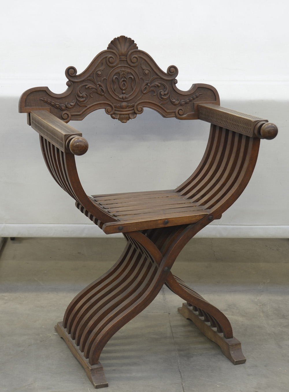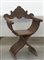Poltroncina "Savonarola" con schienale sagomato e intagliato a motivi vegetali