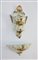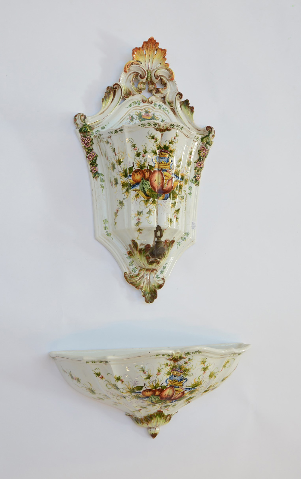 Acquamanile in maiolica decorata in policromia a frutti e foglie e in rilievo a fiori (difetti)