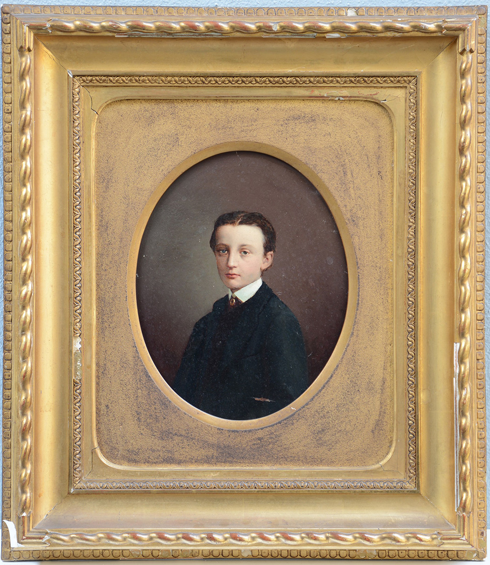 Scuola del sec. XIX "Ritratto di ragazzo in abito scuro" olio su cartone ovale (cm 21x17) in cornice