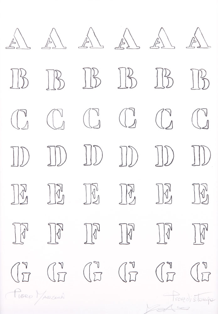PIERO MANZONI Soncino (Cr) 13/07/1933 - Milano 06/02/1963 Lettere dell'alfabeto stampa su carta cm. 50x35, prova di stampa, firma in basso a sinistra, tiratura fuori commercio.