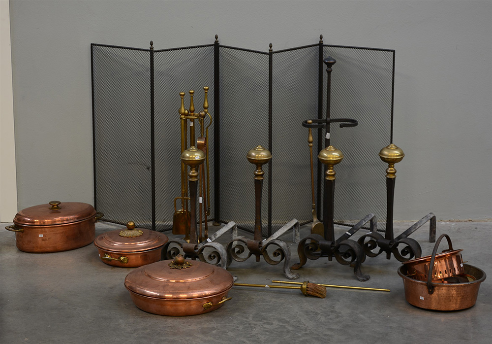 Lotto composto da due coppie di alari da camino, un parascintille e numerosi attrezzi in ferro e ottone