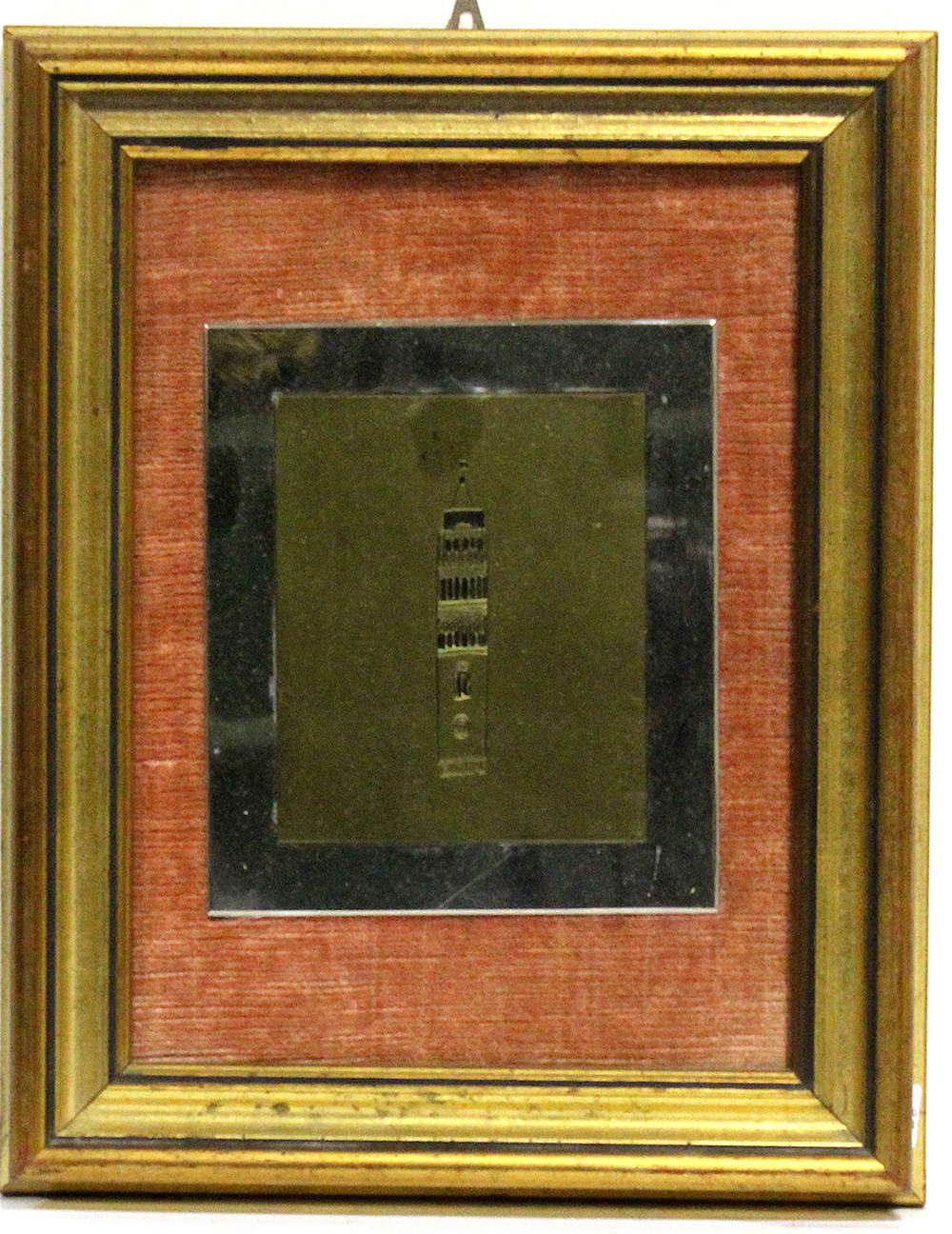 "La torre" incisione su placca in rame ottonato con cornice in metallo cromato (cm 15x13) firmata in basso al centro, in cornice (lievi difetti)