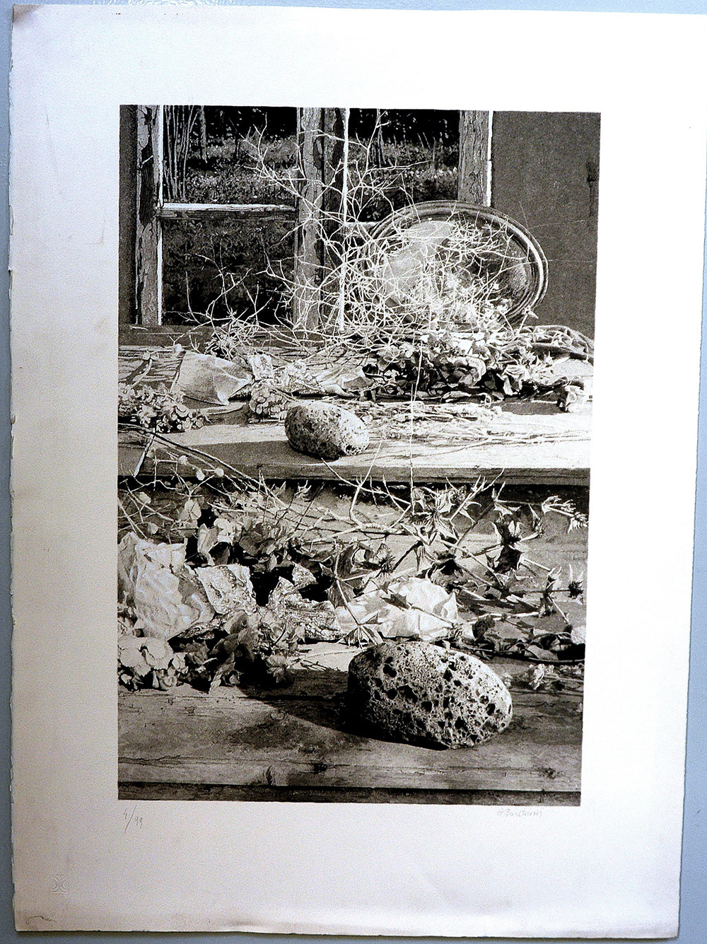 "Senza titolo" litografia (cm 80x58,5) numerata 4/99 e firmata in basso a matita. Timbro a secco in basso a sinistra (lievi difetti)