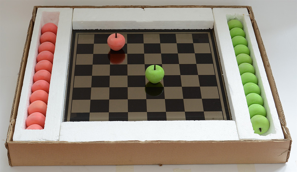 "Giuoco di Dame e Cavalieri"1978, esemplare n. 56/100, edizioni Mario Bulgarelli, Milano. Gioco della dama con scacchiera a specchio serigrafata e firmata, e dodici pedine a forma di mele verdi e rosa in resina acrilica; in contenitore cartonato. Si allega certificato di garanzia (difetti e restauri)