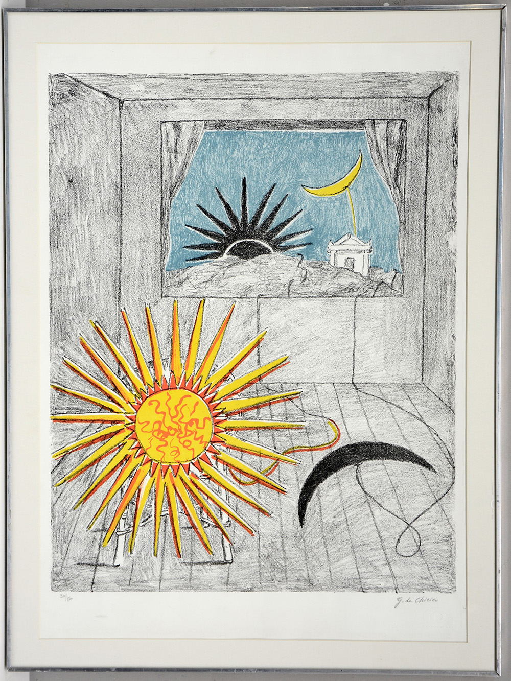 "Il sole e la luna in una stanza" litografia a quattro colori (cm 67x48) es. 30/76 firmata a matita in basso a destra. Etichetta di autenticità al retro, in cornice