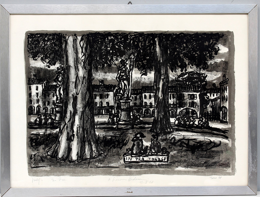 Ignoto "In Pra" 1968, litografia (cm 50x68), titolata, dedicata, firmata "Tono" e datata in basso a matita. In cornice (lievi difetti)