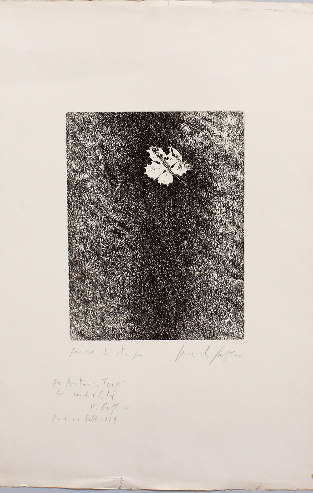 "Senza titolo" acquaforte - prova di stampa (lastra cm 32,5x25; foglio cm 70x50). Iscritta, firmata e dedicata in basso a matita (lievi difetti)