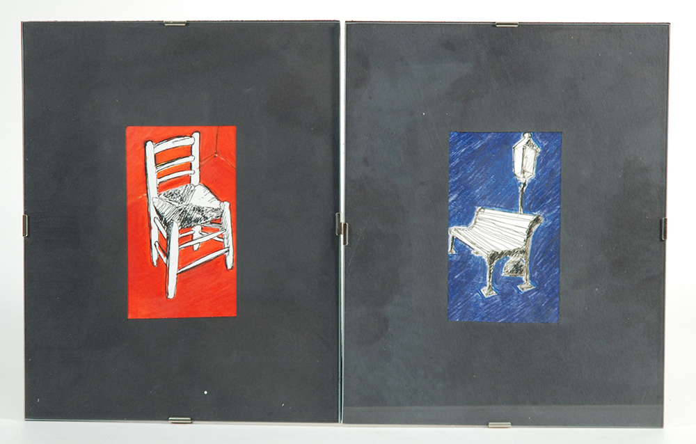 "Sedia" e "Panchina" 2004, china e pennarelli su cartoncino (cm 12x7) Firmati al retro