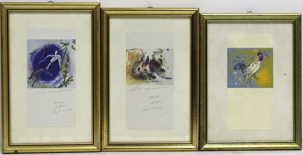Sei biglietti d'auguri di formato e soggetto differenti, stampanti su cartoncino, tutti firmati dall’artista ed alcuni accompagnati da dedica. In cornici (lievi difetti)