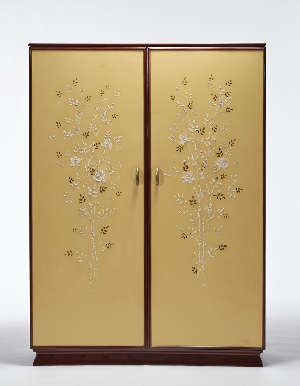 Guardaroba da ingresso in legno di palissandro indiano a due ante laccate crème con decori floreali dipinti, attribuibili a Adriano Spilinbergo. Interni in ottone, cristallo e tessuto trapuntato. Etichetta metallica "Arredamenti Borsani Varedo". Anni 50 (cm 130x179x37) (lievi difetti)