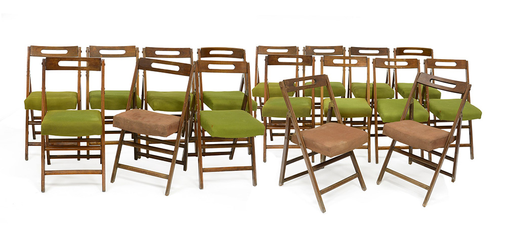 Gruppo di diciassette sedie pieghevoli, struttura in legno massetto, schienalino basculante, seduta rivestita in panno verde. Italia, fine anni 60 (cm 40x77x45) (difetti)