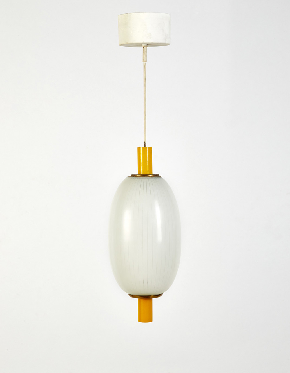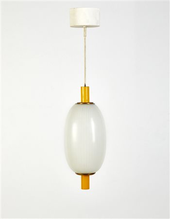 Lampada a sospensione con paralume in vetro soffiato lattimo, struttura verniciata e laccata in bianco e giallo. Produzione italiana, anni 50 (h cm 76) (lievi difetti)