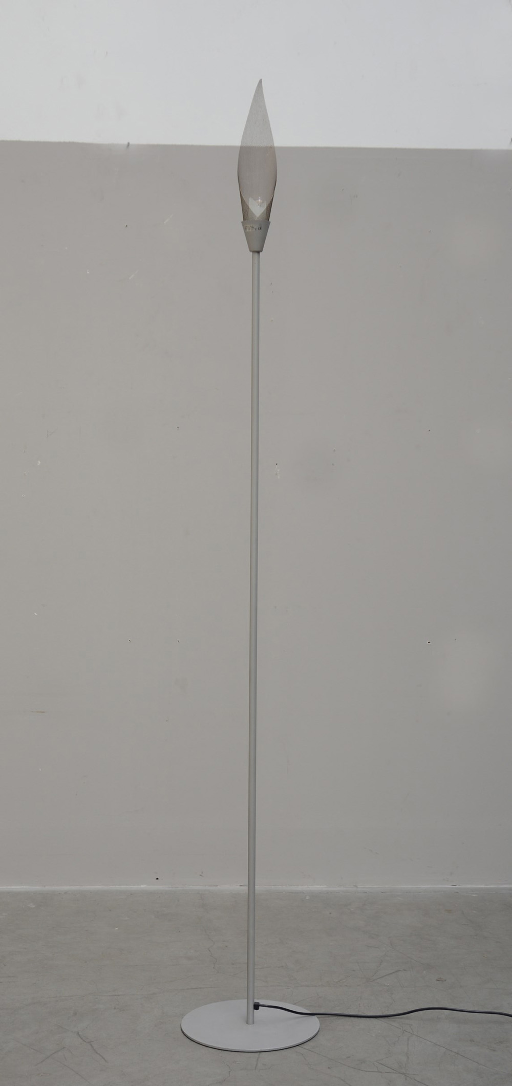 Lampada da terra modello "Atlanta". Produzione recente Oceano Oltreluce. Metallo laccato grigio e rete d'acciaio striata (h cm 202) (difetti)