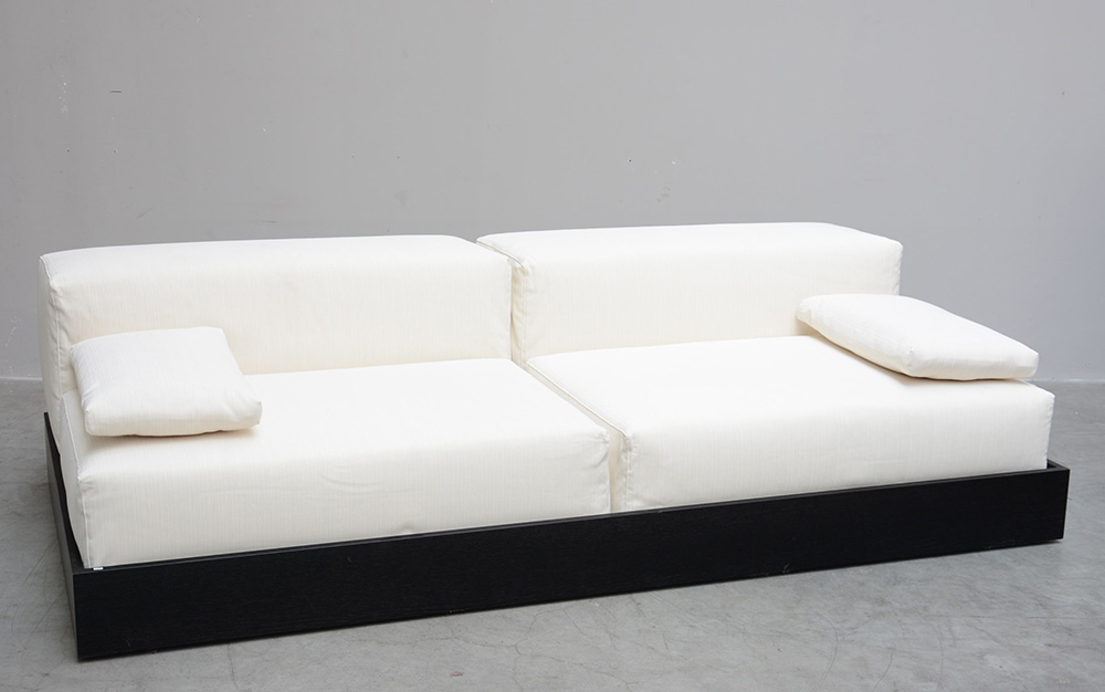 Ilaria Prato Divano lungo imbottito rivestito di bianco con base in wengè...