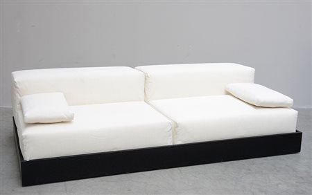 Divano lungo imbottito rivestito di bianco con base in wengè modello "Polp1". Produzione BBB Bonacina (cm 210x60x110)