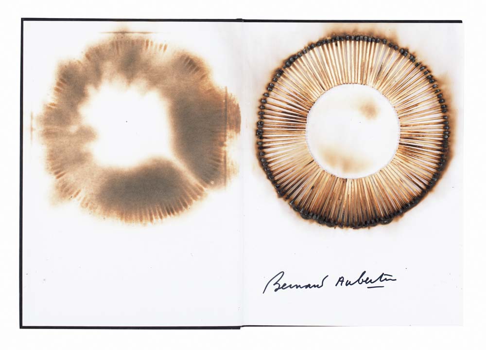 BERNARD AUBERTIN Fontenay aux Roses 1934  Senza titolo  applicazioni di fiammiferi e combustioni su libro "Bernard Aubertin, il fuoco e il rosso", edizioni Galleria Rosenberg cm. 31x45, firma in basso a destra, dichiarazione d'autenticità dell'artista su foto, entro teca in plexiglass.