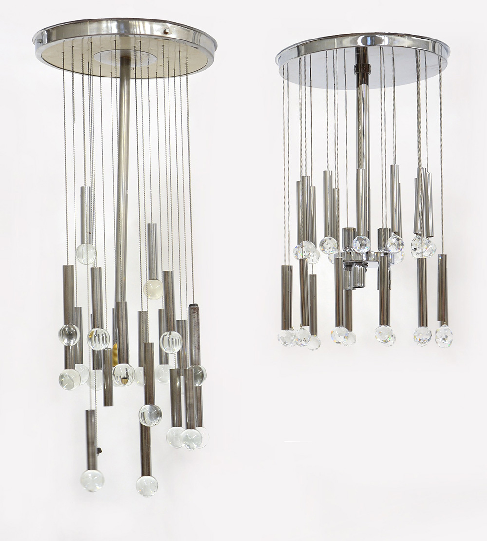 Lotto di due lampade a sospensione in acciaio cromato con pendenti a sfere di vetro. Italia, anni 70/80 (difetti)