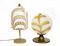 Lotto composto da due lampade da tavolo con struttura in alluminio ottonato e diffusori in vetro soffiato lattimo e a macchie sui toni del beige e del pagliesco. Italia, anni 70 (h cm 45 e h cm 60) (lievi difetti)