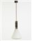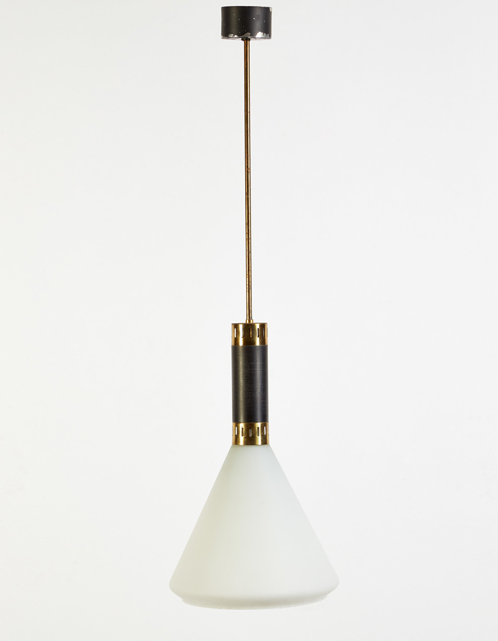 Lampada a sospensione in metallo verniciato nero e ottone, diffusore in vetro incamiciato lattimo. Italia, anni 60 (h cm 90) (lievi difetti)