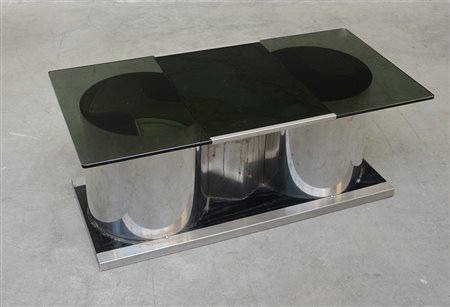 Tavolino da salotto con sostegni in acciaio cromato di forma cilindrica base in legno nero, piano girevole in vetro fumè. Produzione Domustil, Italia, anni 70 (cm 100x39x50) (difetti e mancanze)