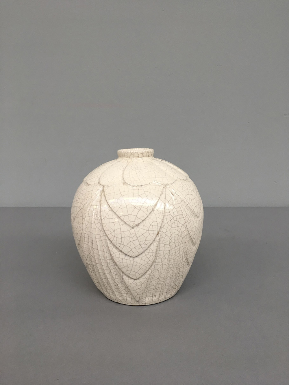 Manifattura europea. Vaso a collo stretto in gres modellato con rilievi floreali geometrizzati e smaltato in bianco craquelé. 1925 ca (h cm 18) (lievi difetti)