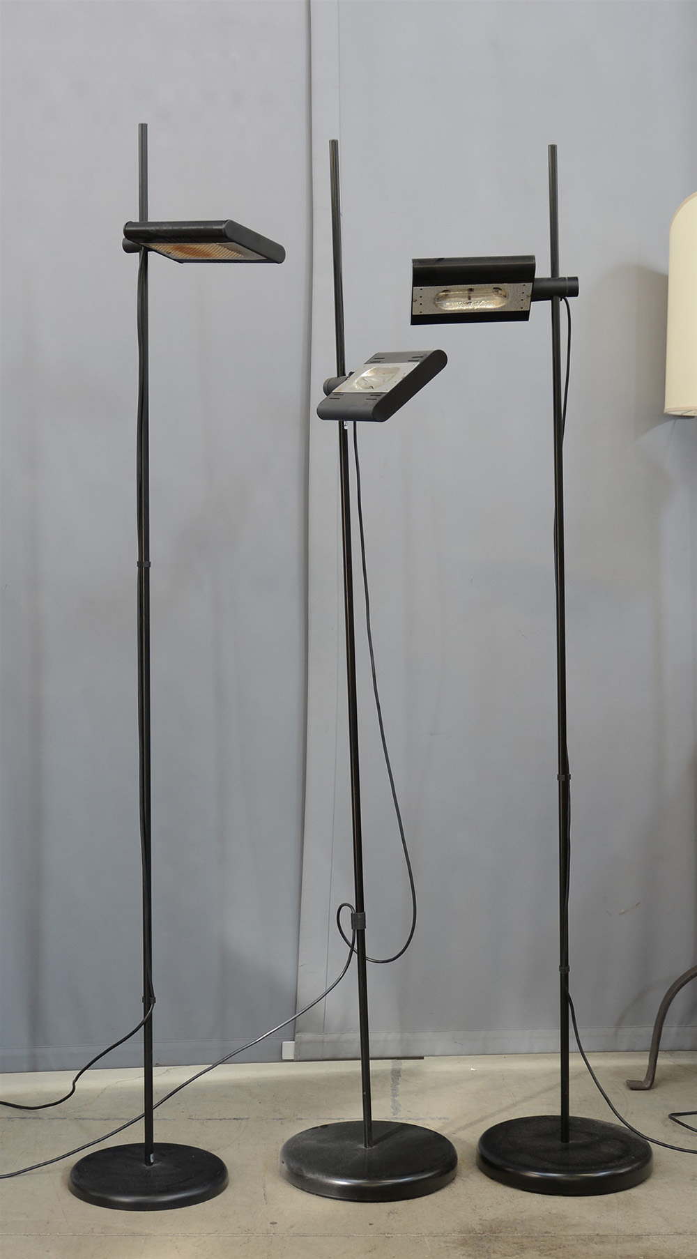 Lotto di tre lampade da terra alogene in metallo laccato nero. Italia, anni 80 (lievi difetti)