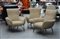 Tre poltrone imbottite rivestite in lana creme, con struttura in tondino...