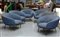 Sei poltrone imbottite rivestite in lana blu, con struttura in tondino...