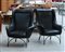 Due poltrone imbottite rivestite in semipelle nera, con struttura in tondino...