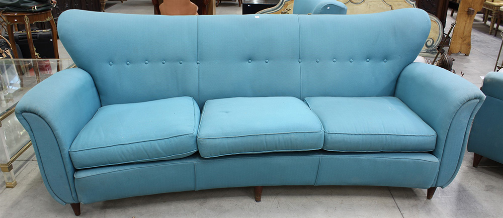 Divano imbottito rivestito in tessuto turchese con gambe troncoconiche in legno. Italia, anni 50 (cm 190x92x85) (lievi difetti)