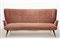 Divano imbottito a tre posti con struttura in legno, rivestimento in velluto rosa antico e gambe troncoconiche in mogano. Esecuzione Domus Nostra, Bologna, 1955 ca. (cm 210x 93x80) (lievi difetti)