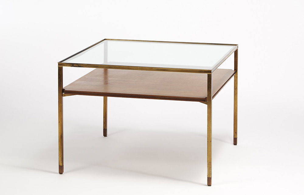 Tavolo da salotto, due ripiani, con struttura in ottone, piano superiore a vetri, puntali in legno. Italia, anni 60 (cm 78x56x78) (difetti)