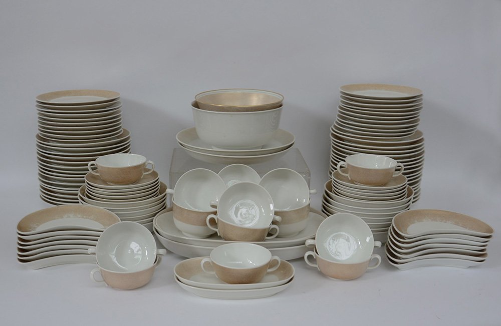 Manifattura Richard Ginori, pittoria di Doccia, servizio da tavola in porcellana decorata con ampia fascia color oro ad effetto sabbiato, composto da:tredici fondine, trentatrè piatti piani, venti piatti da frutta, quattordici antipastiere a mezzaluna, tredici tazze da brodo con piattini, due salsiere, un'insalatiera, due piatti tondi da portata e quattro ovali, a cui si unisce un'insalatiera di decoro simile. Marcato sotto la base con monogramma della manifattura in oro, marchio "Richard Ginori" in verde e numerale del decoro 1512E (difetti)