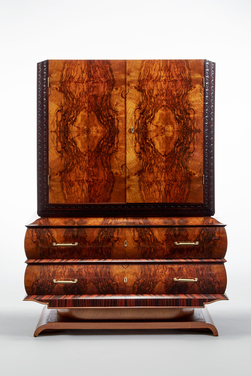 Mobile-archivio in legno lastronato e impiallacciato in radica e zebrano con profili intagliati a motivi geometrici déco. Base a due cassetti su piedistallo a slitta, alzata a due ante. Interno a ripiani, sportelli e otto cassettini con cassaforte metallica. Italia, anni 30 (cm 125x60x125) (lievi difetti)