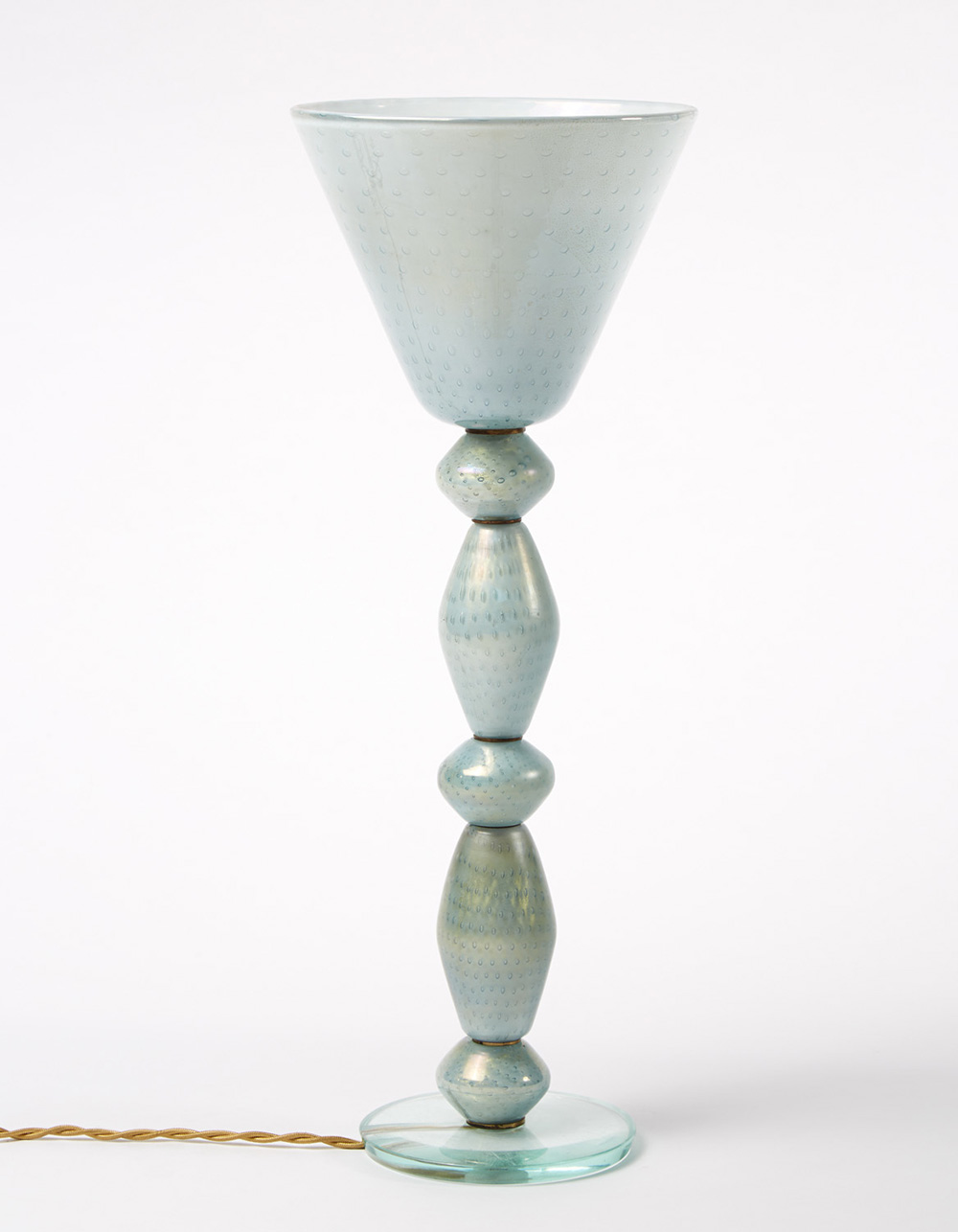Manifattura di Murano. Lampada da tavolo in vetro incamiciato lattimo e azzurrino iridato sulla superficie esterna con inclusione di foglia d’oro e bolle regolarmente distribuite. Anni 60-70 (h cm 61) (lievi difetti alla base)