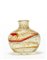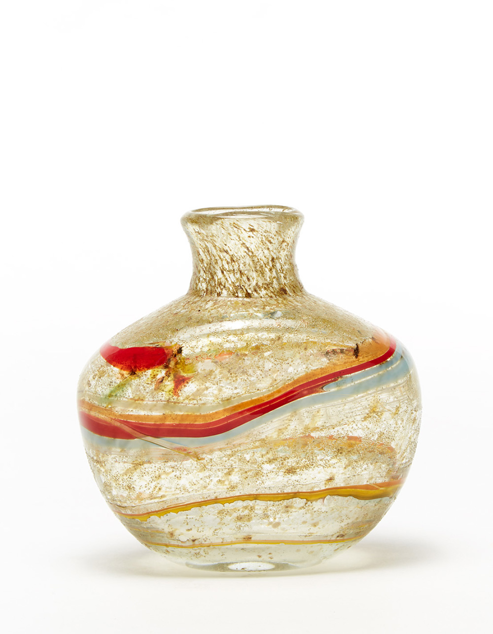Manifattura ingnota. Vaso in vetro soffiato incolore a fasce irregolari rosse, celeste, verde, lattimo, giallo e arancio, con applicazioni senza fusione. Sec XX (h cm 18)