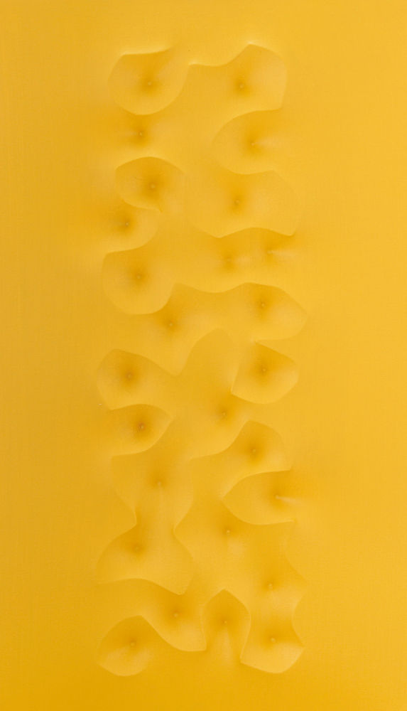 GIUSEPPE AMADIO Todi 19/05/1944  ACURI  tela estroflessa gialla cm. 60x33,5; firma e titolo al retro, dichiarazione d'autenticità dell'artista su foto, opera senza cornice.