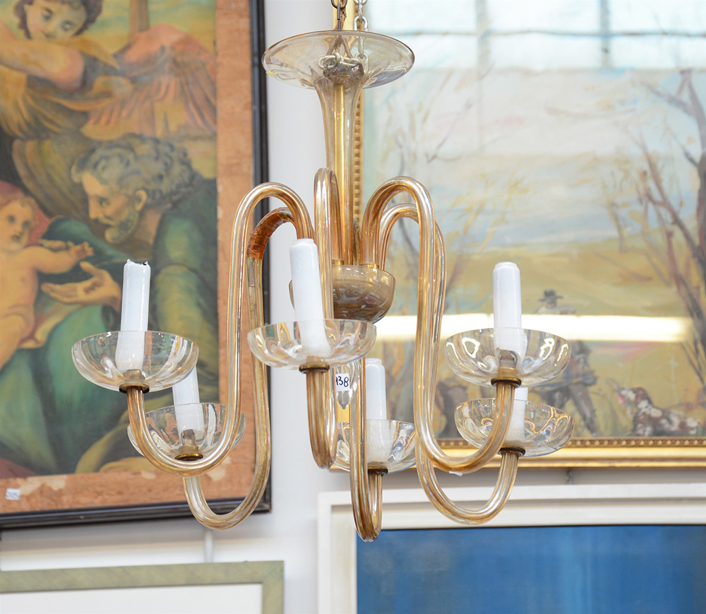 Manifattura di Murano. Lampadario in vetro soffiato pagliesco a a sei braccia...