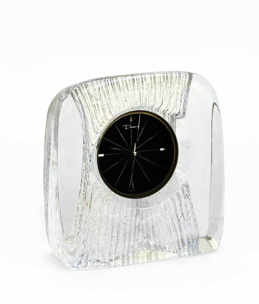 Orologio da tavolo in vetro massello soffiato in stampo. Francia, anni 80. Firma a punta in basso a destra (h cm 21)